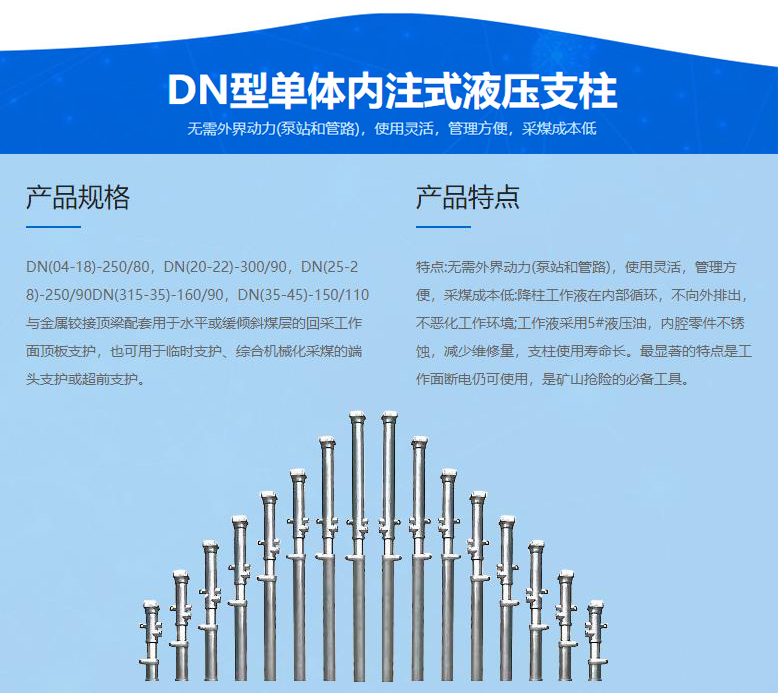 特點:無需外界動力(泵站和管路),使用靈活,管理方便,采煤成本低:降柱工作液在內(nèi)部循環(huán),不向外排出,不惡化工作環(huán)境;工作液采用5#液壓油,內(nèi)腔零件不銹蝕,減少維修量,支柱使用壽命長。最顯著的特點是工作面斷電仍可使用,是礦山搶險的必備工具。